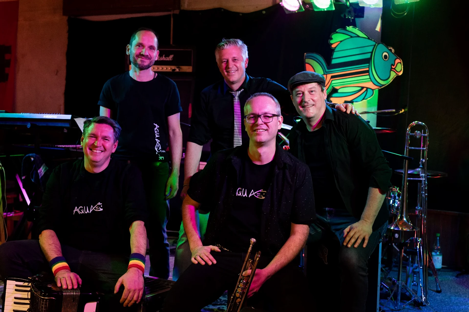 Fünf Leute, sieben Instrumente: In der Besetzung Schlagzeug, Bass, Trompete, Akkordeon, Gitarre, Tuba und Synthesizer bringen satte Beats und treibende Riffs schnell den eigenen Fluss der Gefühle in Wallung und versetzen hier Herz und Beine gleichermaßen in strudelige Bewegungsfreude. Zusätzlich verschärft eine gehörige Portion Selbstironie in den Texten der Band noch die hitzige Liveatmosphäre und ist damit der berühmte Tropfen, der das Konzert-Fass – oder besser gesagt das Konzert-Aquarium – zum Überlaufen bringt.