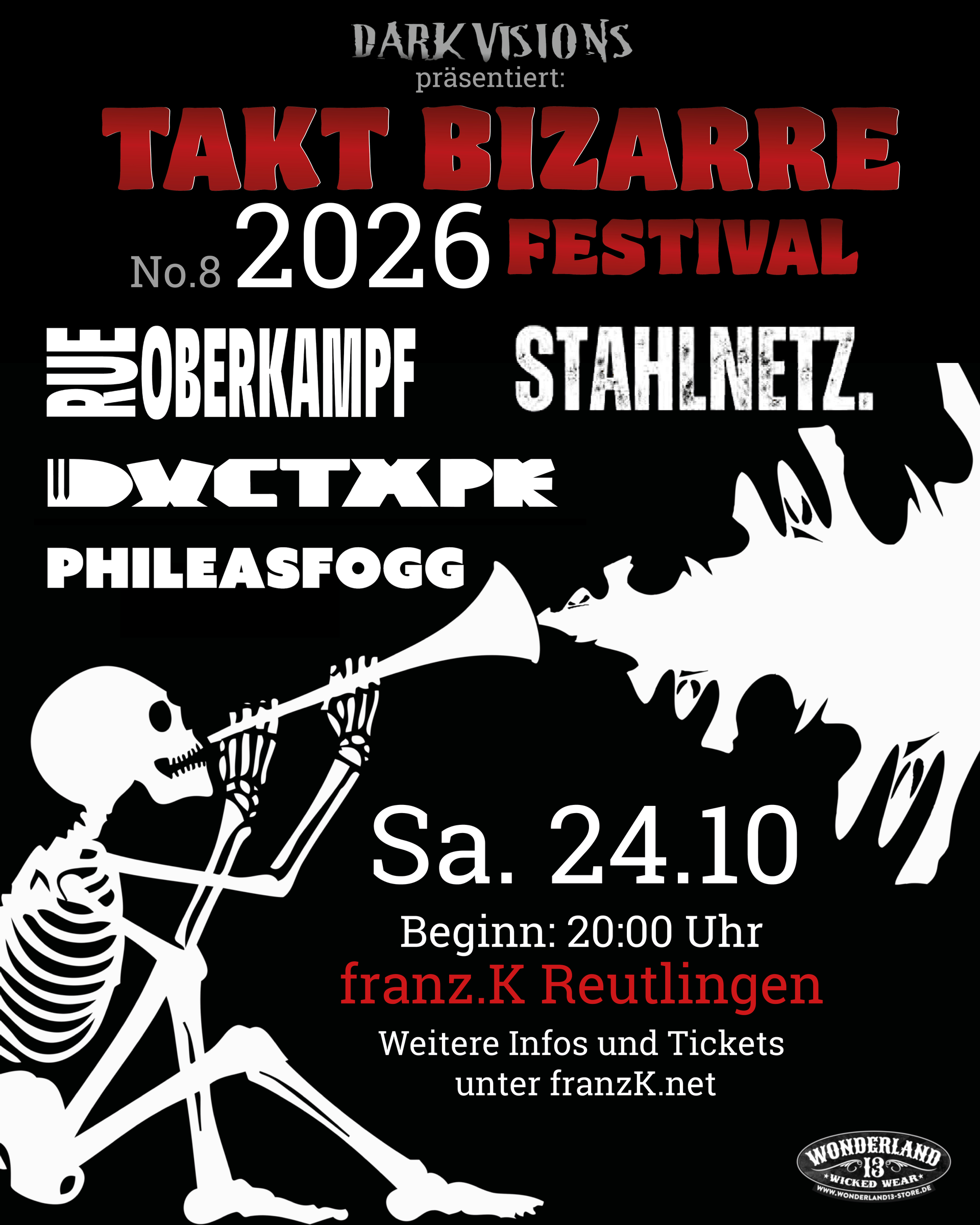 Das Dark Visions-Team und das franz.K präsentieren gemeinsam das achte TAKT BIZARRE Festival. Seit 2018 hat das Festival als eigenes Wave & Gothic Festival in Reutlingen seinen festen Platz im Kalender und über Ländergrenzen hinweg Fans begeistert!